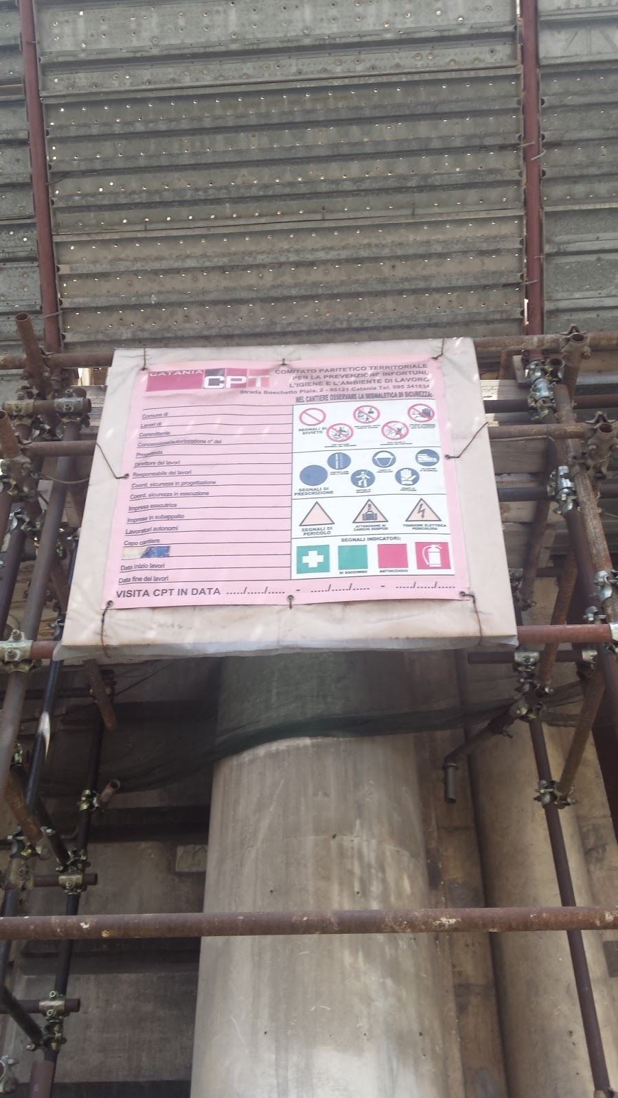 In entrambi i lati prospicienti la Piazza più importante di Catania, Piazza Stesicoro e quella strada principale, Via Etnea, ecco, messi lì in bella evidenza, appesi su quel ponteggio due super-poster, incredibilmente immensi...Si tenga conto che per restare posizionati lì su quelle strutture reticolari, era obbligo del progettista eseguire i relativi calcoli...